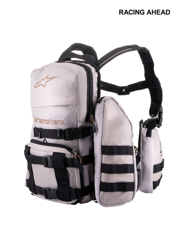 Ergonomische Schultergurte mit perforierter Schaumstoffpolsterung und Mesh-Paneelen für einen optimierten Luftstrom, verstellbare und abnehmbare Brustgurte sowie die magnetische Brustschnalle von Alpinestars für eine schnelle und sichere Anpassung.